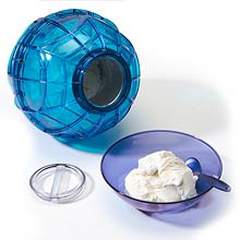 "Well, you see… you put the ingredients in this side and close the lid," he turned the ball around inside its box. "Then you put the ice and rock salt in this side. Shake it around for a while or play catch or anything that will keep the ball moving and presto chango, ice cream."
